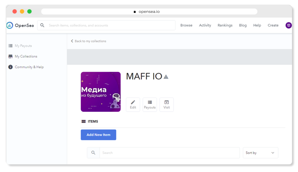Мы попадаем на страницу только что созданной коллекции. Предметов пока нет, но есть кнопка «Add New Items». Нажимаем ее.
