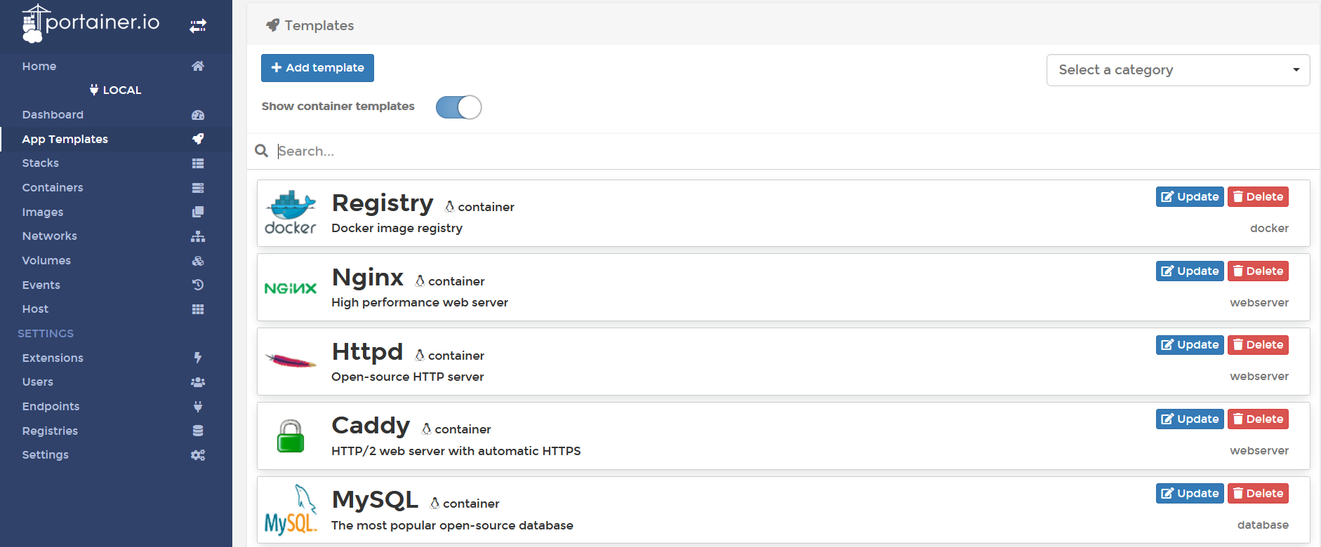 В панели управления в разделе «App Template» можно найти шаблоны с ПО и запустить их в контейнерах.
