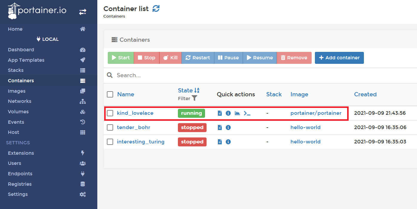 В разделе «Containers» можно увидеть все статусы по контейнерам на сервере. В нашем случае один контейнер с текущей панелью Portainer, а в двух других запущенные ранее тестовые образы hello-world.
