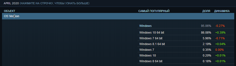 Результаты опроса пользователей Steam в апреле 2020 г. Используемые версии Windows