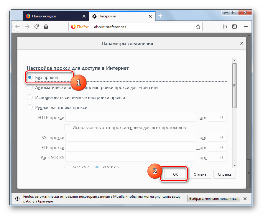 После указанных выше действий доступ в интернет через прокси-сервер для браузера Mozilla Firefox будет отключен.