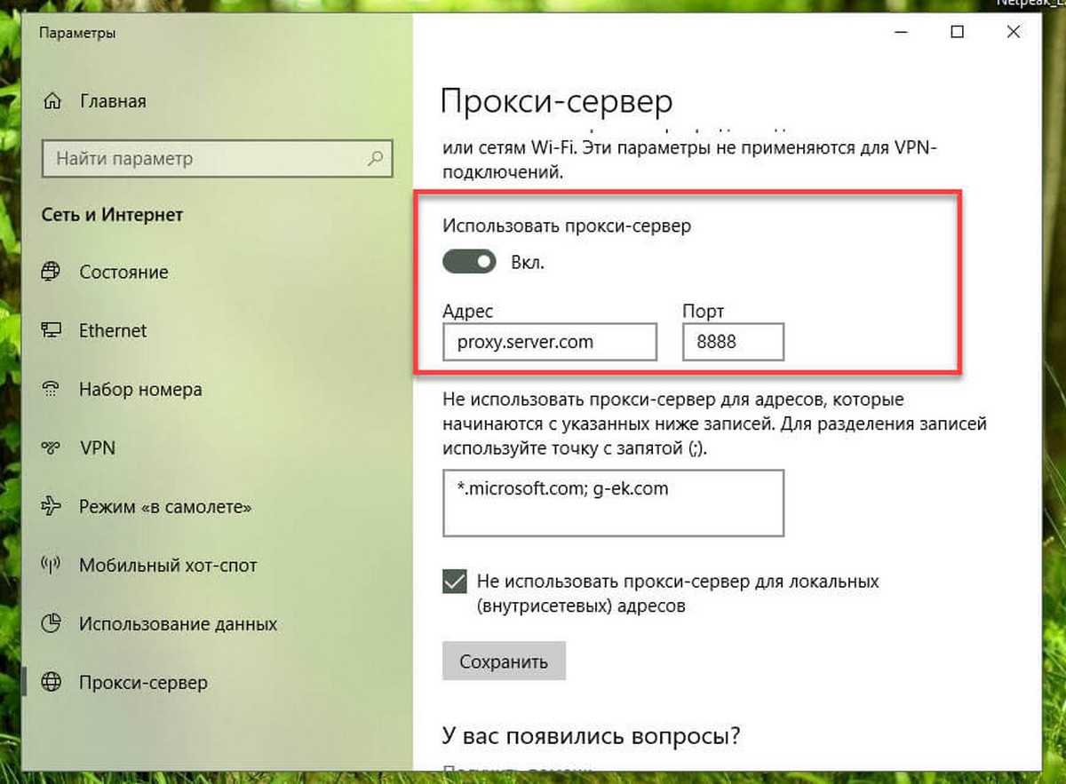 Как обойти прокси-сервер для локальных адресов в Windows 10?