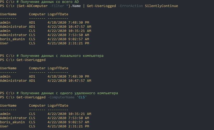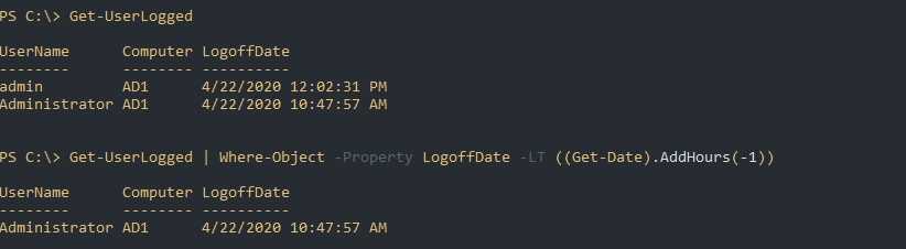 «Get-Childitem -Path ‘\\Computer1\C$\Users’, ‘\\Computer2\C$\Users’ «; - LogoffDate — это отдельный тип данных даты и времени, а это значит, например, что мы можем увидеть кто вышел за последний час/сутки. Пример будет ниже.