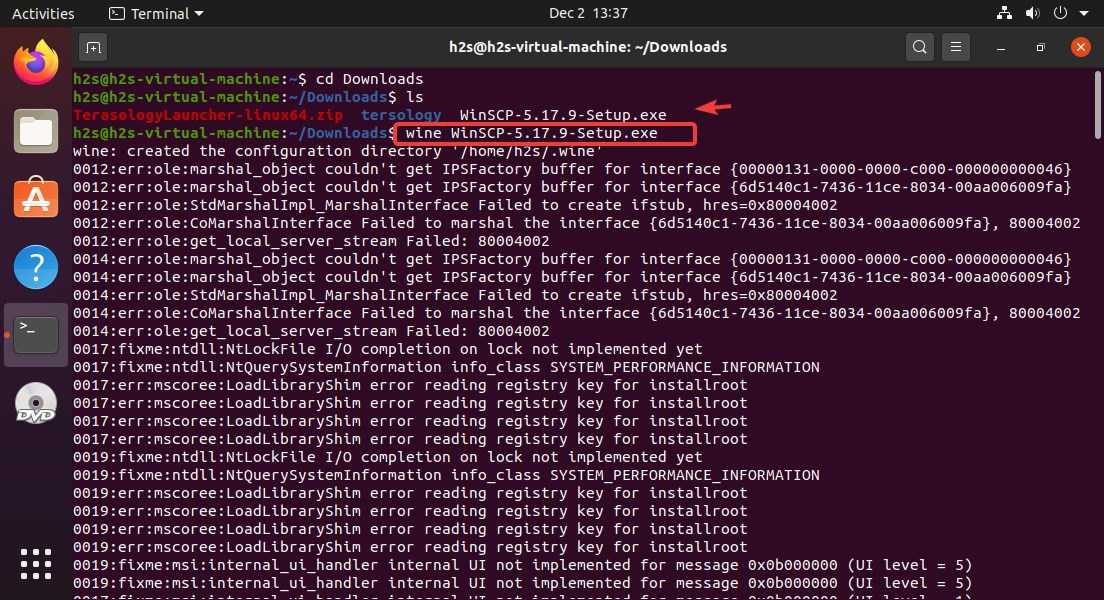 Now, you will see the available WinSCP executable file, use that with the Wine command to install it over your Linux OS.