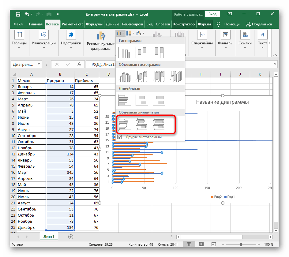 - Изменять фигуру линейчатой диаграммы можно тогда, когда она изначально была создана в трехмерном формате, поэтому сделайте это сейчас, если график еще не добавлен в таблицу.