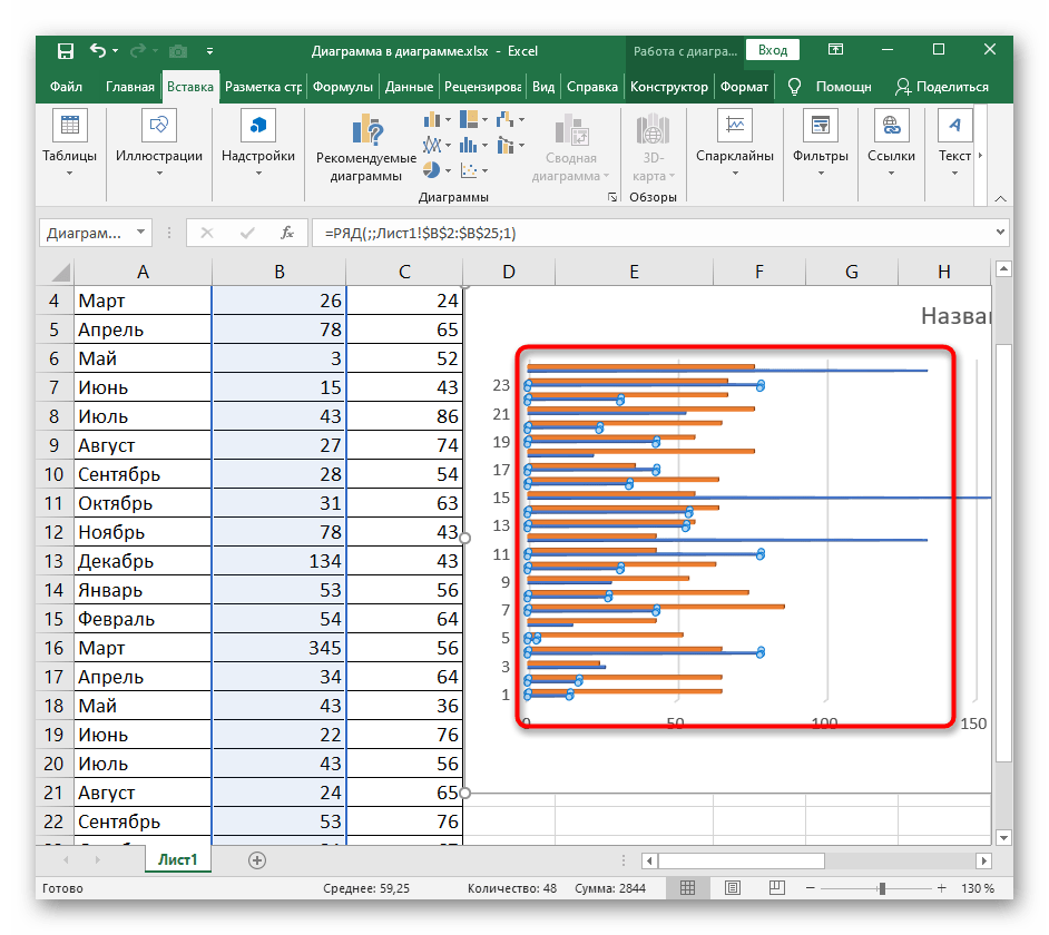 Приложение Excel позволяет совмещать в одной диаграмме несколько типов. В качестве примера совместим тип графика и гистограммы.