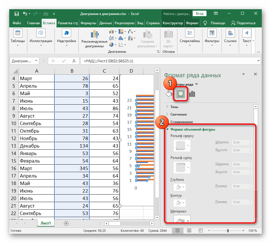 Сразу же после этого откройте раздел посередине, отвечающий за редактирование формата объемной фигуры. Задайте ей рельеф, контур и присвойте текстуру при надобности. Не забывайте следить за изменениями в диаграмме и отменять их, если что-то не нравится.