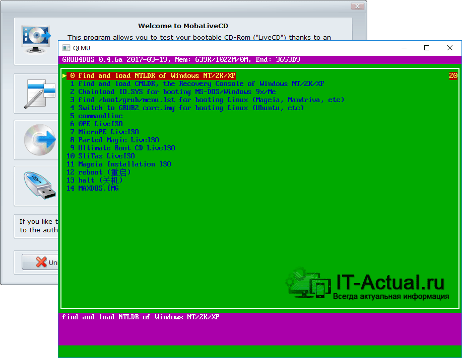 Однако если вы редактируете меню, добавляя новые пункты для загрузчика, то оперативнее будет просматривать изменения с помощью утилиты MobaLiveCD.