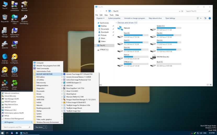 Загрузочный диск Windows 10 и 8 PE — для обслуживания компьютеров, жестких дисков и разделов, резервного копирования и восстановления дисков и разделов, диагностики компьютера, восстановления данных, установки Windows. Он включает в себя множество бесплатных программ для восстановления данных, таких как R-Studio 8.7, Active File Recovery, Active Partition Recovery, Runtime GetDataBack для NTFS, Runtime GetDataBack для FAT, DM Disk Editor и Data Recovery, UFS Explorer Professional Recovery, Hetman Partition Recovery, Eassos Recovery , Мастер восстановления данных EaseUS и Ontrack EasyRecovery
