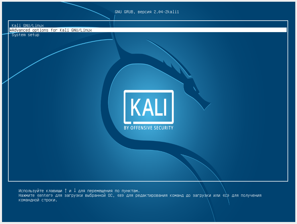 При загрузке выберите Advanced options for Kali GNU/Linux →