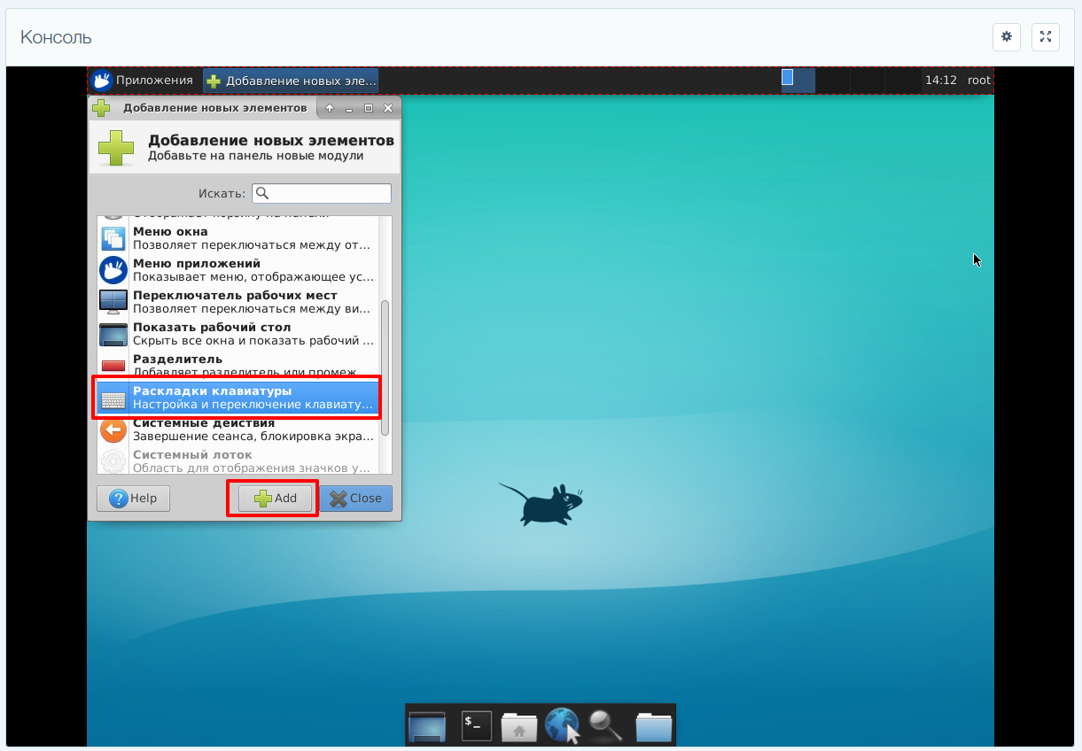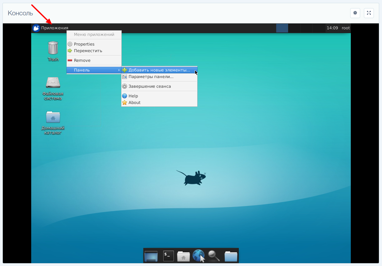 6. Добавьте апплет клавиатуры на панель инструментов, чтобы переключаться между раскладками. Для этого кликните правой кнопкой на «Приложения» в левом верхнем углу и выберите «Панель» — «Добавить новые элементы»: