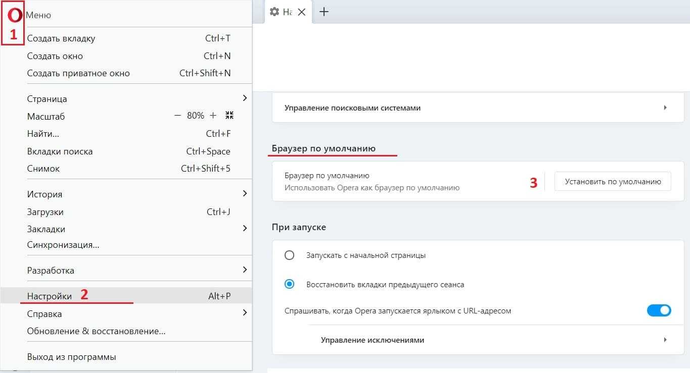Рис. 6. Настройки в Опере и предложение «Установить по умолчанию» Оперу.