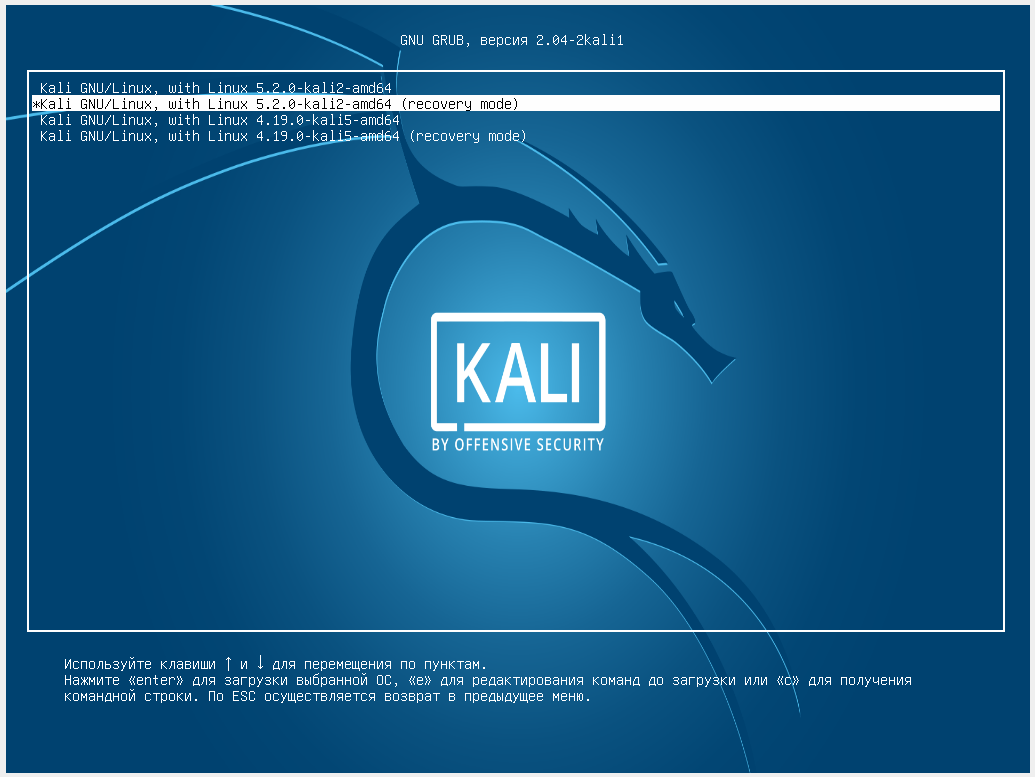Затем Kali GNU/Linux, with Linux * (recovery mode).