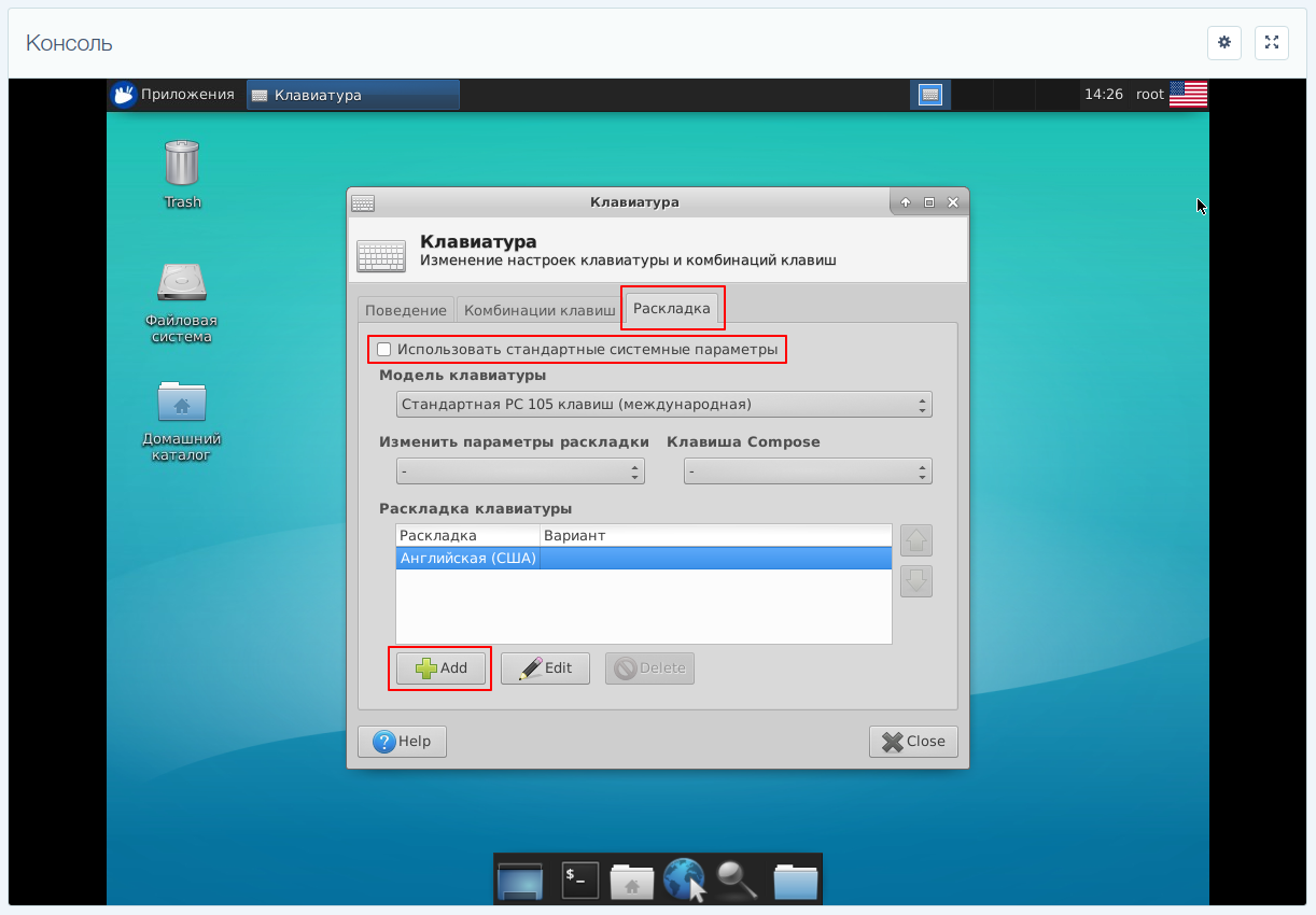 9. В новом окне перейдите на вкладку «Раскладка», снимите галку «Использовать стандартные системные параметры» и нажмите «Add»: