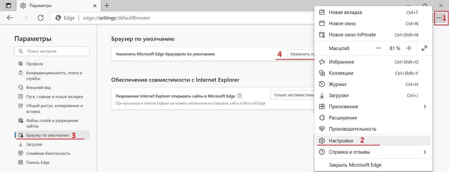 Для этого следует в правом верхнем углу браузера Edge щелкнуть на значок меню, который состоит из трех горизонтальных точек (рис. 7). В левой колонке кликнуть по строке «Браузер по умолчанию», далее – клик по кнопке «Назначить по умолчанию».