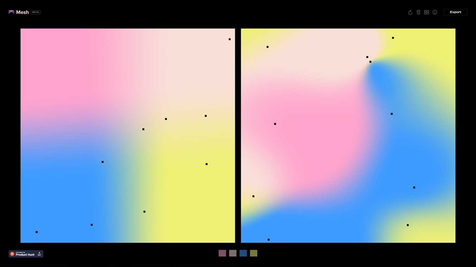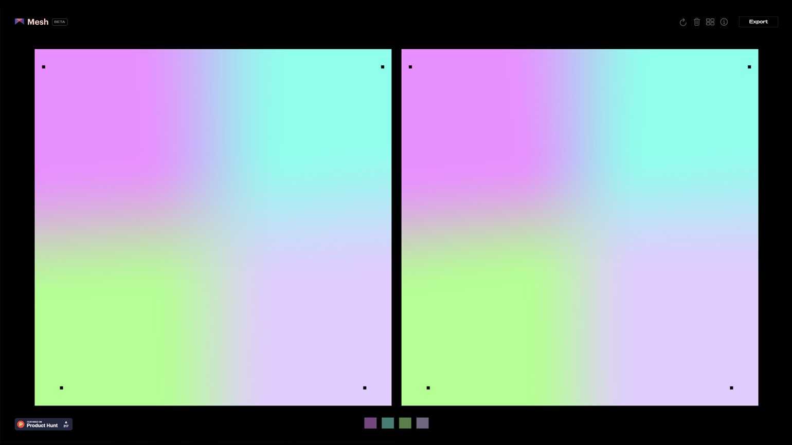 Принцип работы сервиса Mesh очень сильно отличается от плагина Figma. В нижней части экрана задаются цвета углов, а для создания градиента используются два окна.