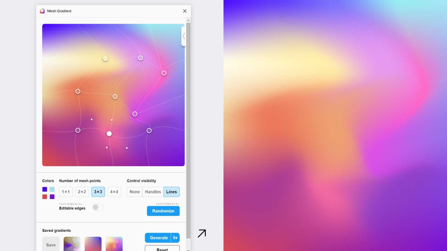 Рассмотрим интерфейс плагина. В нём можно настроить размер сетки, цвета из углов градиента, отображение элементов управления, а также управление опорными точками mesh-градиента. Для ленивых сделана кнопка Randomize, которая создаёт случайный сетчатый градиент.