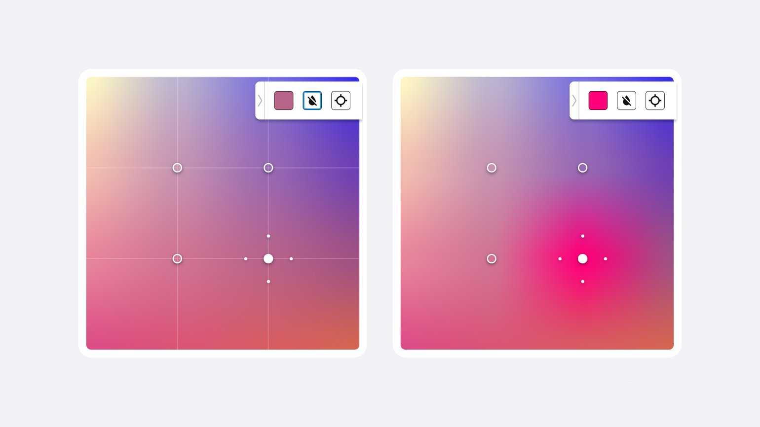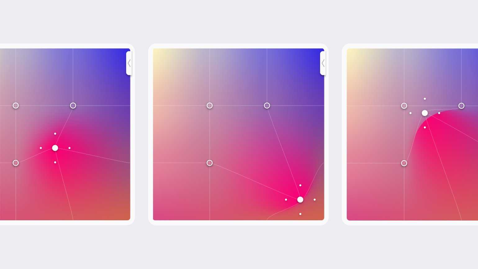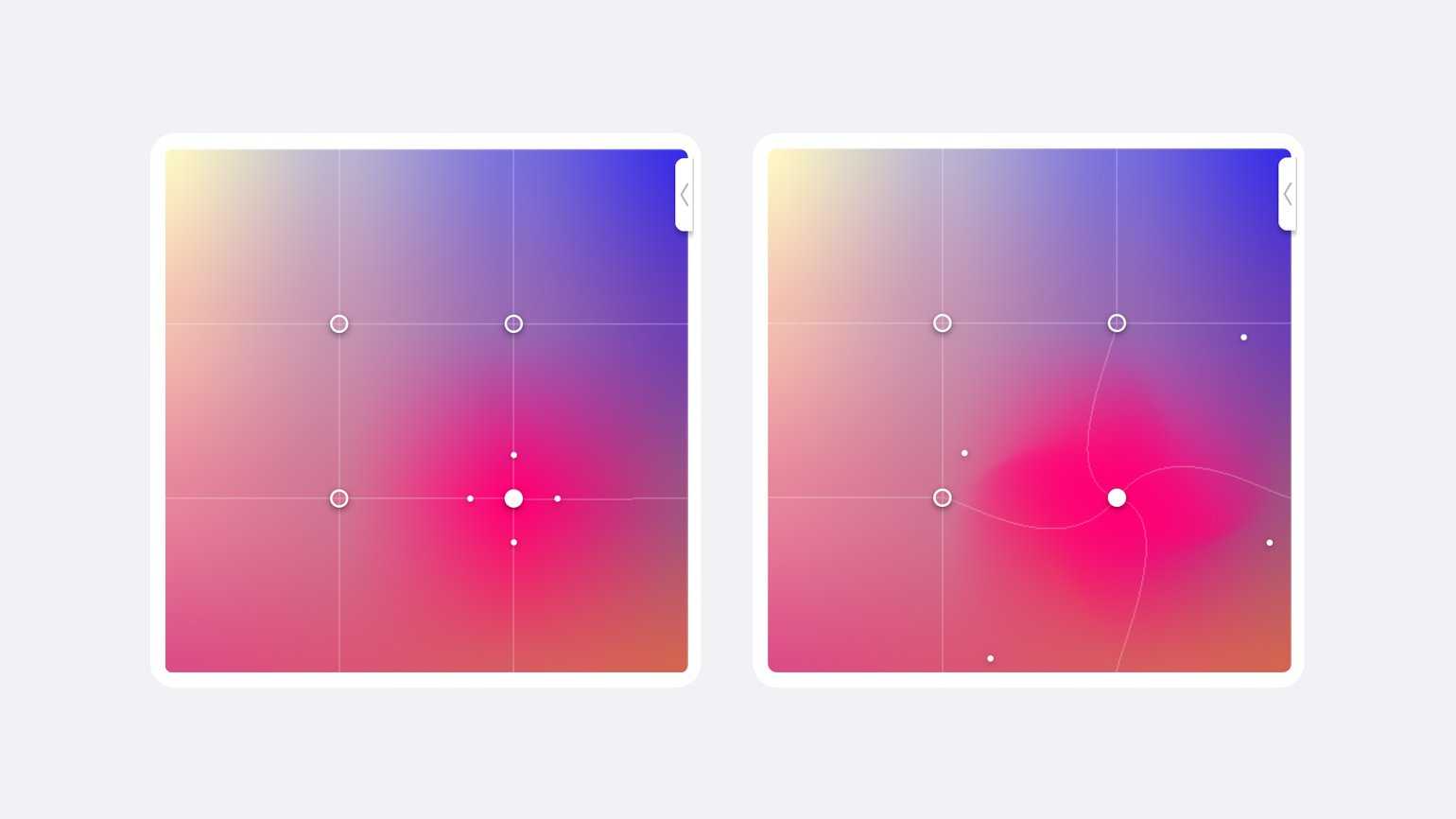 В левом окне положение точки влияет на то, с какой силой она будет распространять цвет: чем ближе точка к углу, тем больше её цвета будет на градиенте в правой части. Положение точек в правом окне влияет на взаимодействие цветов друг с другом: чем точки ближе, тем переход более резкий, чем дальше — тем более плавный.