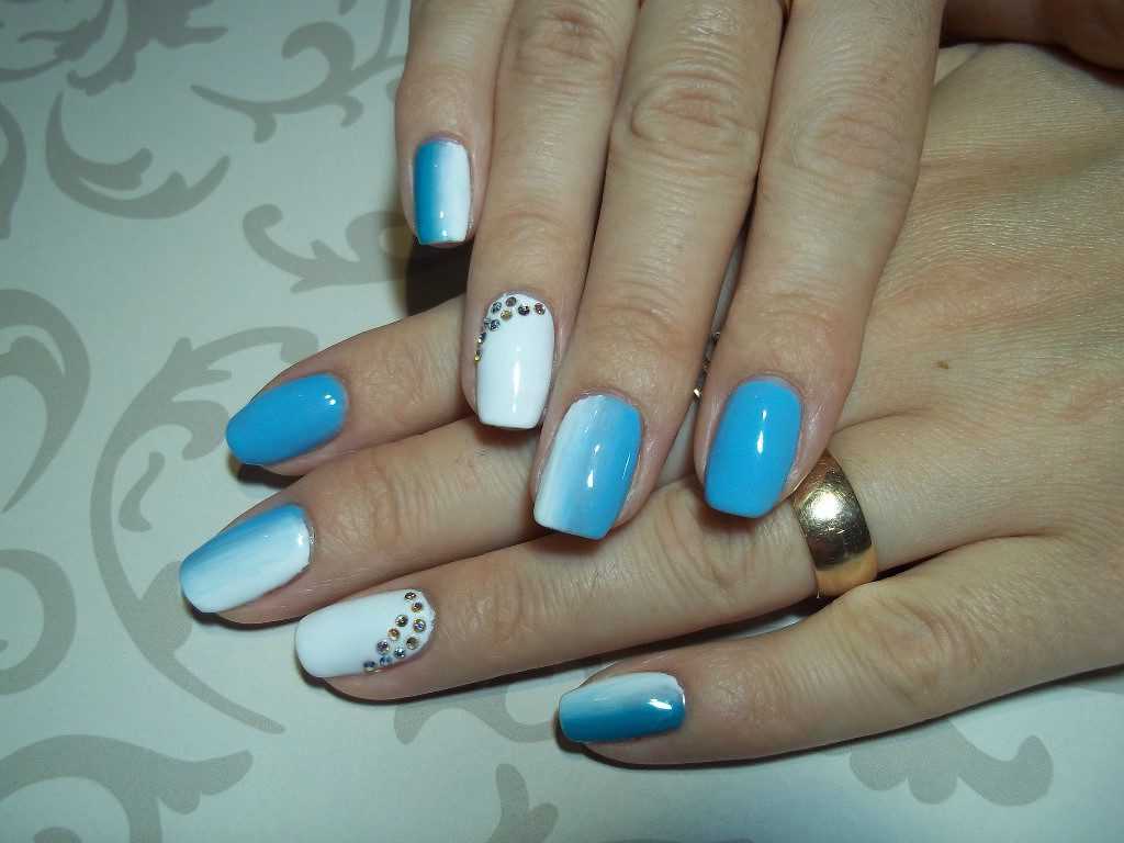 Если в дизайне задумано только два колора, основной и вспомогательный, примените более легкий вариант. На пластину нужно нанести основной цвет, высушить в лампе и переходить к окрашиванию ноготка в более светлый тон. Легкими движением вспомогательным колором, светлого тона, делает градацию. Спонжем отпечатываем лак, едва касаясь пластины. После чего необходимо воспользоваться закрепляющим лаком или нанести топ на ноготок.