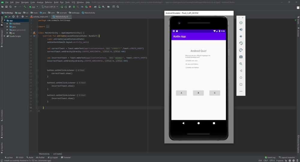 Нажмите зеленую кнопку воспроизведения в Android Studio IDE, убедившись, что виртуальное устройство настроено или устройство Android подключено. Вы увидите, что игра появится на экране, и вы сможете выбрать вариант ответа. Вот так да! Клик на «A» отобразит правильное сообщение, а два других должны отобразить неправильное сообщение.
