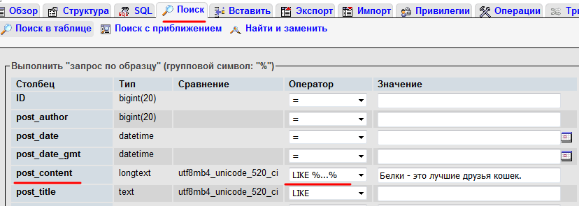 Давайте предположим, что в наши записи закрался текст, выделенный жирным «Белки — это лучшие друзья кошек». Не ищите никакого смысла в этой фразе — ее просто нет. Зато есть необходимость найти все вхождения этих слов, причем обрамленных тегами , во всех записях и страницах. Поэтому сначала воспользуемся поиском для столбца post_content: