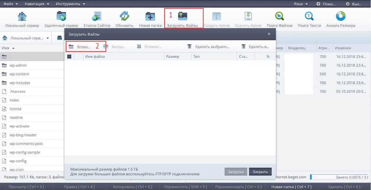 Зайдите в эту папку нажав 2 раза. Теперь вы попали в корневую папку своего сайта. Теперь нажмите “Загрузить файлы” и “Browse…”
