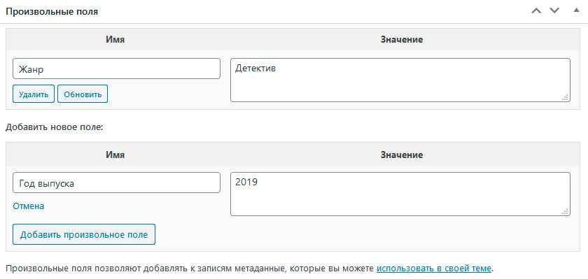 Одной из часто встречаемых задач при создании отдельных типов постов является необходимость не только изменить верстку страниц, но и добавить определенные типы шаблонной информации. В случае с книгами это: автор, год выпуска, жанр и прочее.