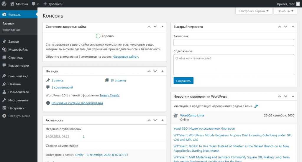 После входа в систему вы попадете на главный экран консоли, который называется . Здесь начинается настройка вашего сайта.