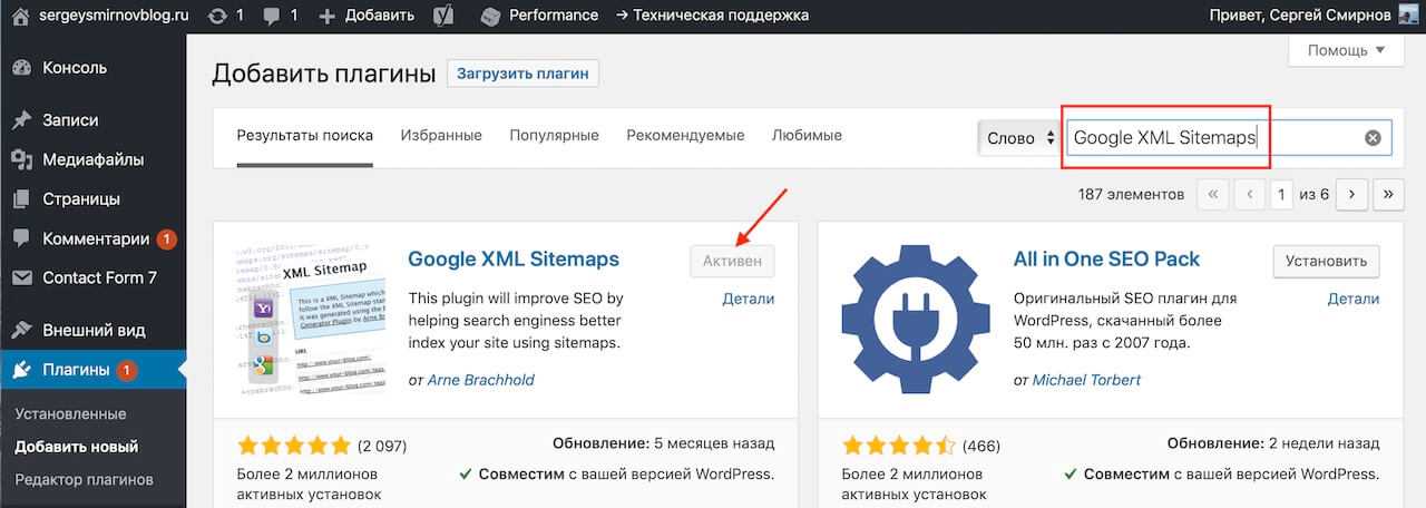 Переключите вкладку на “рекомендуемые” и найдите такой плагин. Google XML Sitemaps. Если его нет в списке, то скопируйте название и введите его в строку поиска, как показано на картинке.