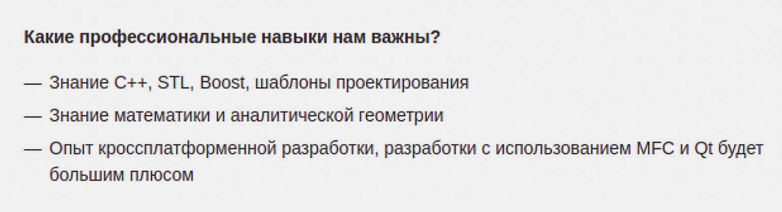 Человека, который решил попробовать себя в программировании или просто не знаком с C++, такое количество иностранных слов может отпугнуть. Но опытный разработчик на C++ знает, что STL, Boost, MFC — это всего лишь библиотеки, а Qt — фреймворк. То есть в этой вакансии от вас требуется знание всего одного языка программирования — C++. И это, в общем-то, уже верхний уровень российского рынка.