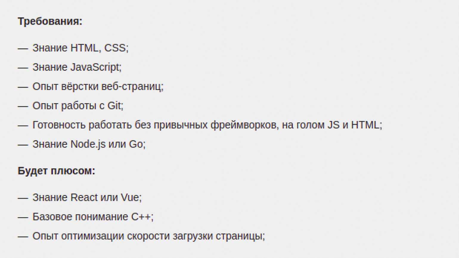 С HTML и CSS мы разобрались выше. React, Vue.js, Node.js опять-таки инструменты профильного языка представленной вакансии — JavaScript