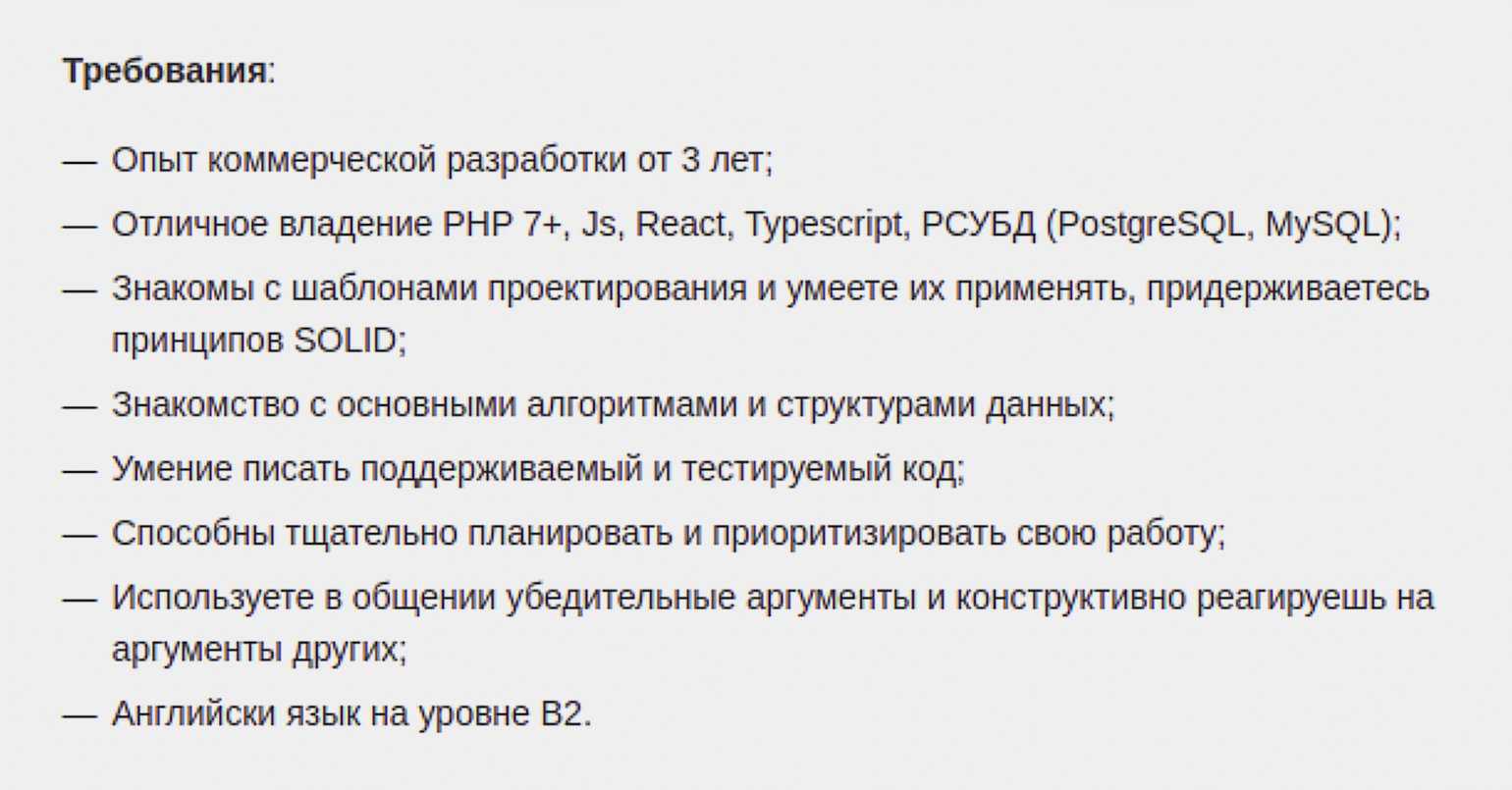 Но вернёмся к минимальному порогу. Всё же знать четыре языка звучит реалистичнее, чем 20. Насколько часто IT-компании ищут таких эрудитов? Чтобы ответить на этот вопрос, я изучил несколько сотен вакансий на hh.ru. Большинство позиций с зарплатой от 150 тысяч выглядят примерно вот так: