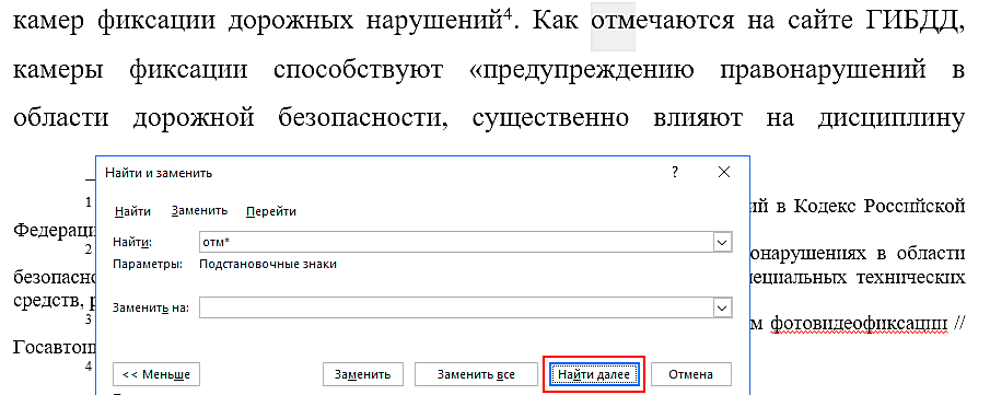 Скорее всего, самым часто используемым подстановочным символом для вас станет звёздочка. Она означает, что вы хотите найти любое количество символов. Например, чтобы найти все слова, начинающиеся с «отм», напечатайте «отм*» в строке поиска и затем кликните кнопку «Найти далее». Наше регулярное выражение означает любое количество букв (* звёздочка), следующих после «отм».