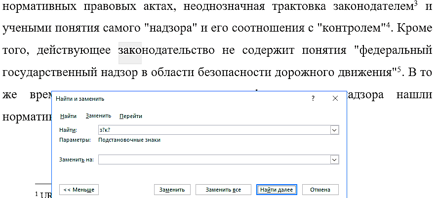 Например, чтобы найти слова, в которых первая буква «з», затем идёт любой другой символ, а затем буква «к» и вновь любой символ, шаблон для поиска «з?к?» найдёт: