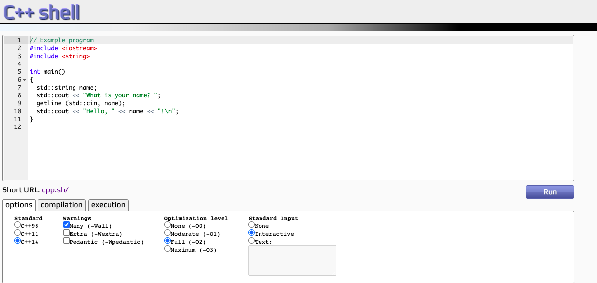 В настройках можно выбрать стандарт языка (С++98, С++11, С++14), тип уведомлений об ошибках (Wall, Wextra, Wpedantic), уровень оптимизации кода, а также прописать параметры инициализации кода и вывода данных. Также в CPP.sh есть две консоли с информацией о компиляции и запуске кода.