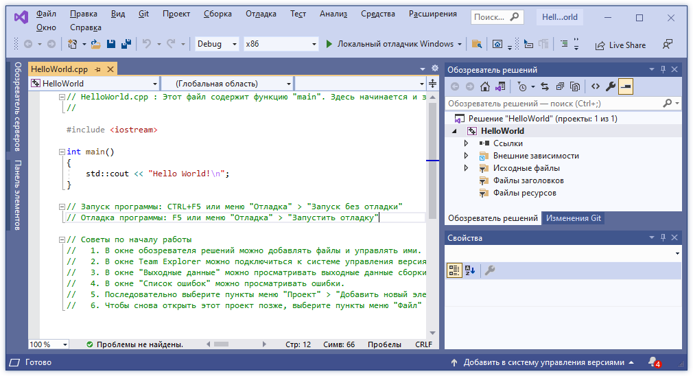 В текстовом редакторе вы увидите, что Visual Studio уже открыла HelloWorld.cpp и создала для вас код. Выделите и удалите весь код и введите/скопируйте следующий код в вашу IDE: