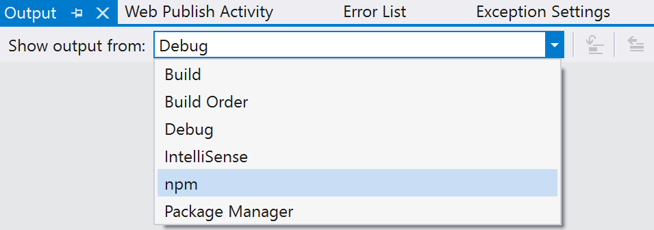 Вы также можете использовать команду в интерактивном окне Node.js для выполнения команды npm. Чтобы открыть окно, в Обозревателе решений щелкните проект правой кнопкой мыши и выберите пункт Открыть интерактивное окно Node.js (или нажмите сочетание клавиш CTRL + K, N).
