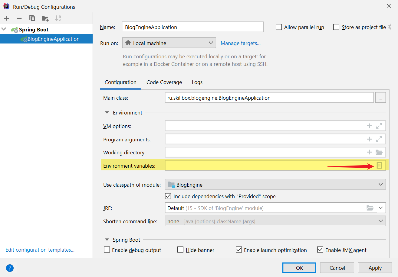 Допишите параметры запуска приложения в поле Environment variables. Удобно зайти в список (кнопка в конце поля, отмеченная на скриншоте) и там ввести значения, если их несколько.