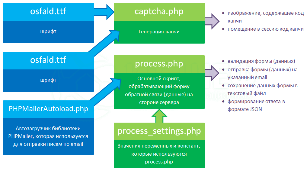 - process.php (скрипта, выполняющего обработку данных формы на сервере; при их успешной проверке осуществляет отправку этих данных на email; результат своего выполнения возвращает в формате JSON);