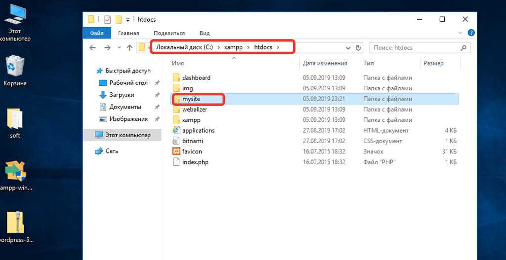 - Заходим в папку C:\xampp\htdocs. и здесь создаем новую папку с именем mysite.ru, а внутри папки создаем файл index.html