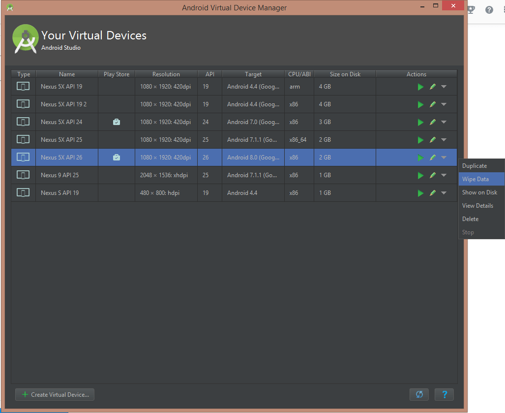 У меня недавно была такая же проблема в эмуляторе Nexus 5 (Android O). Я зашел в диспетчер виртуальных устройств Android и удалил данные пользователя, и это решило мою проблему.
