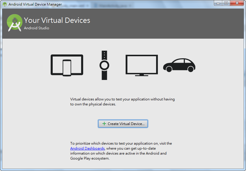 В Android Virtual Device Manager панели, нажмите Create Virtual Device.