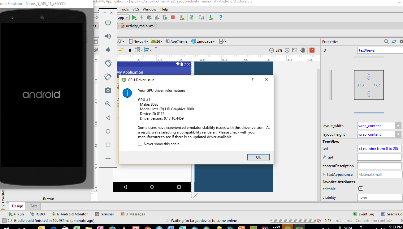 Если же линия индикатора Android эмулятор работает неправильно, эта проблема часто связана с тем, что минимальный SDK вашего приложения выше, чем SDK вашего эмулятора. Если это не так, убедитесь, что у вас есть установщик HAXM в менеджере SDK.