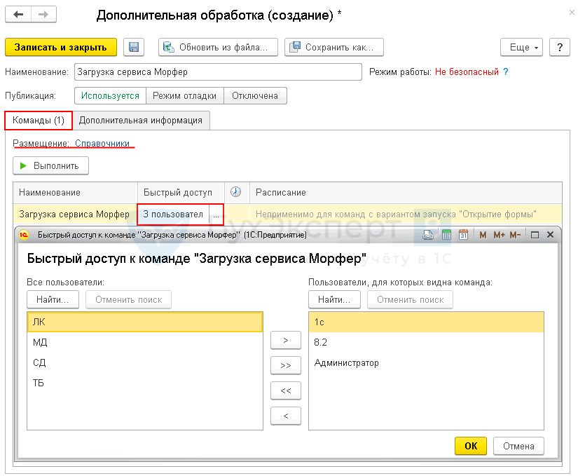 Укажите раздел размещения обработки и пользователей, которым предоставлен доступ к ней.