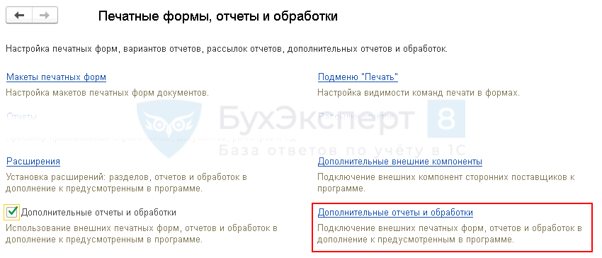 Откройте форму подключения внешних печатных форм, отчетов и обработок в 1С: раздел Администрирование — Настройки программы — Печатные формы, отчеты и обработки — Дополнительные отчеты и обработки.