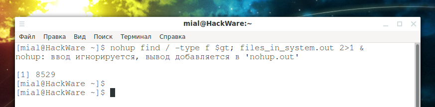Это простой сценарий в котором во время сессии SSH мы запустили команду find для поиска файлов в фоне используя nohup. При отправке работы в фон в приглашение терминала возвращается JOBID и PID процесса.