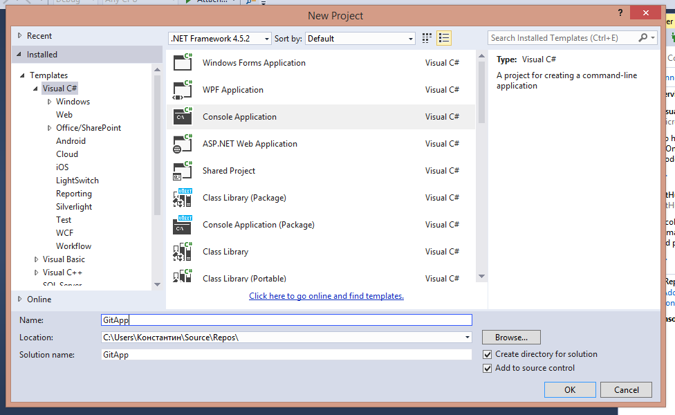 Хочу заметить, что Visual Studio поддерживает Git с коробки, а в версии Visual Studio 2015 можно выбрать установку расширения для работы с GitHub. Мы рассмотрим оба варианта.
