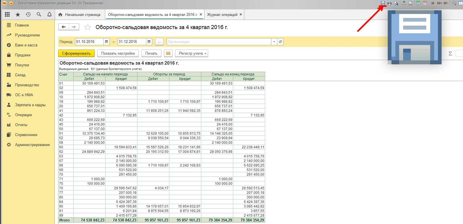 Пример: Оборотно-сальдовая ведомость. Для того, чтобы ее сохранить, необходимо нажать значок дискеты в верхнем правом углу диалогового окна программы. В случае, если эта иконка неактивна, необходимо кликнуть на любое поле отчета для его активизации.
