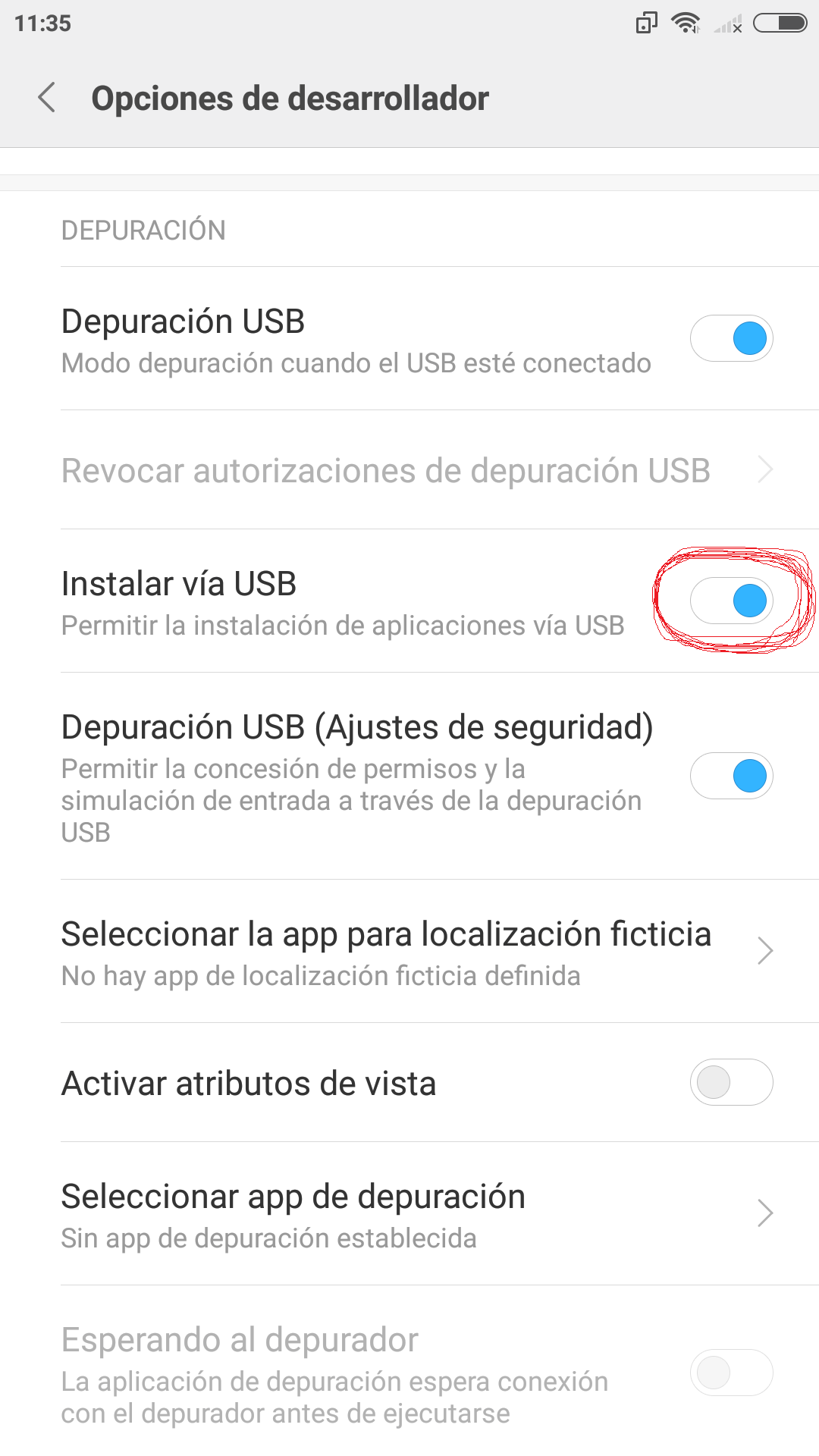 Я зашел в Настройки -> Дополнительные настройки -> Параметры разработчика -> Включить «Установить через USB»