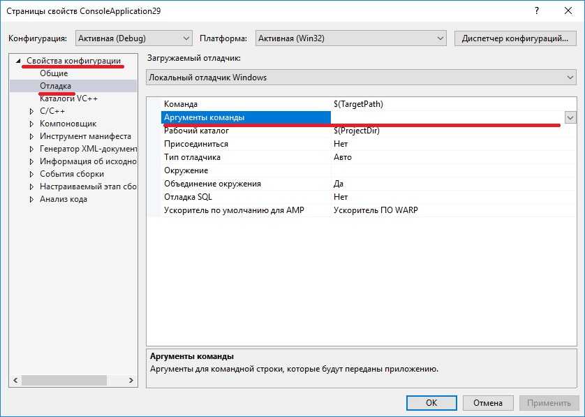 Затем выберите . На правой панели будет строка . Вы сможете здесь ввести аргументы командной строки, и они будут автоматически переданы вашей программе при её запуске: